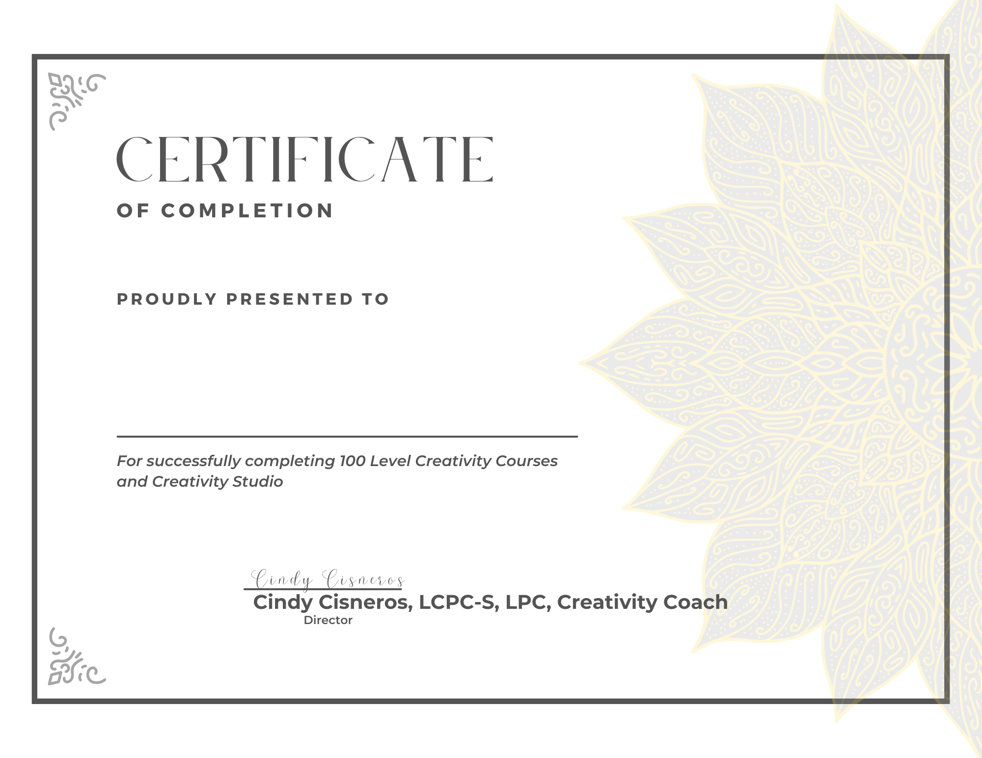 You have successfully completed the 100 Level Courses of the Creativity Courses! What a WONDERFUL ACCOMPLISHMENT! Please do something special to celebrate this investment in your Creativity! And- don't forget to check out the "What's Next?" video, to summarize your accomplishments and prepare you for the next step of your journey!