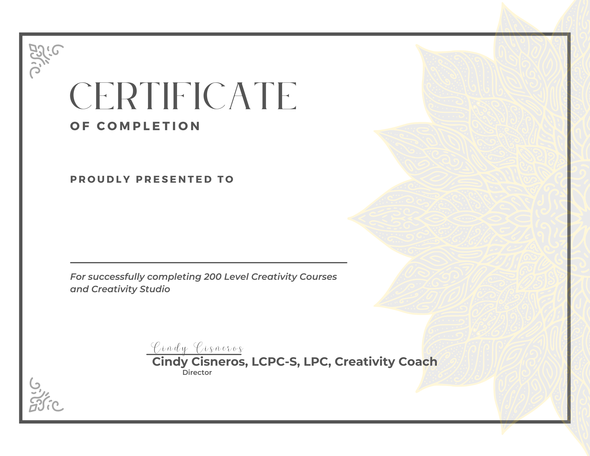 You have successfully completed the 200 Level Courses of the Creativity Courses! What a WONDERFUL ACCOMPLISHMENT! Please do something special to celebrate this investment in your Creativity! And- don't forget to check out the "What's Next?" video, to summarize your accomplishments and prepare you for the next step of your journey!